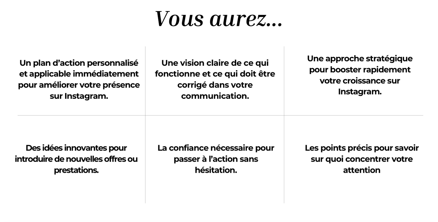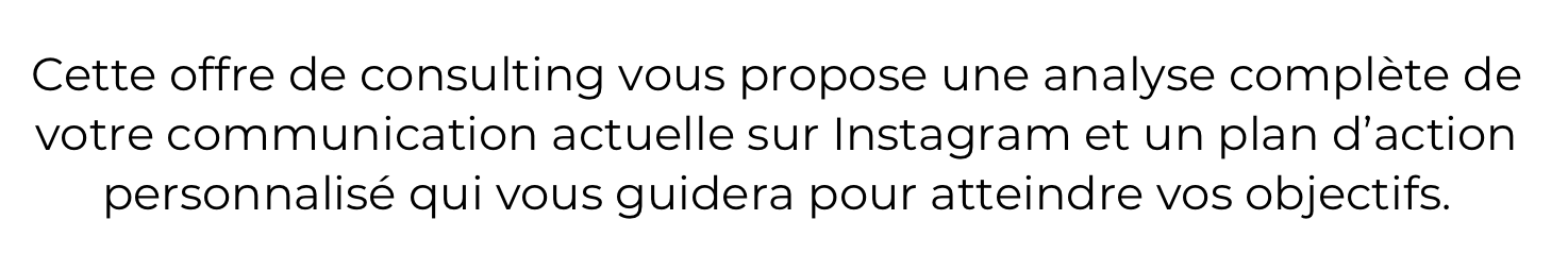 Tu recevras un document détaillé reprenant tout ce que nous aurons abordé, y compris notre analyse, les recommandations pour améliorer ta présence sur Instagram, et le plan d'action à suivre pour réaliser ces améliorations.
