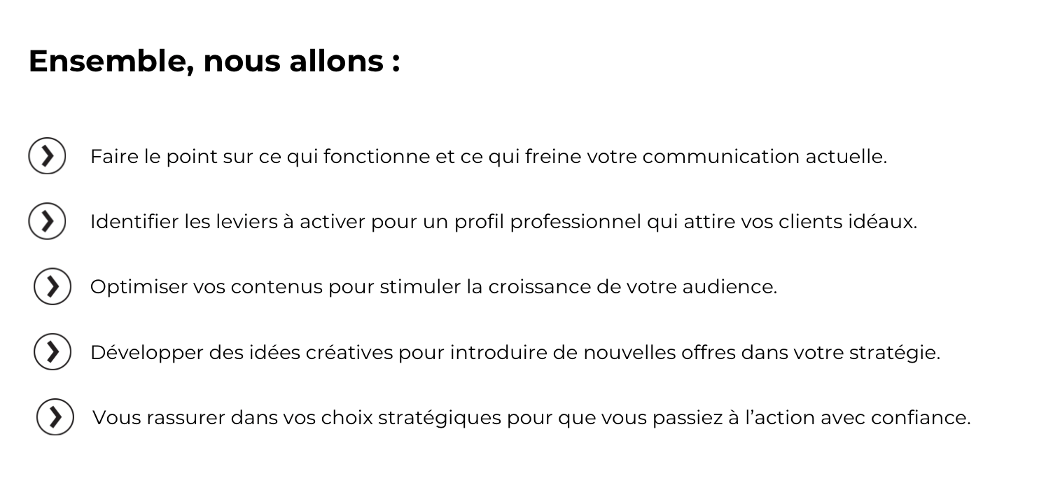 Durant cette session, nous partageons notre analyse et nos observations sur ta marque. Ensemble, nous identifierons les principaux axes d'amélioration et nous te proposerons un plan d'action personnalisé pour les adresser. C'est une opportunité de poser toutes tes questions et de comprendre comment utiliser Instagram avec intention.